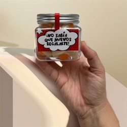 Bote lleno de gominolas con la frase: -No sabia que huevos regalarte-.